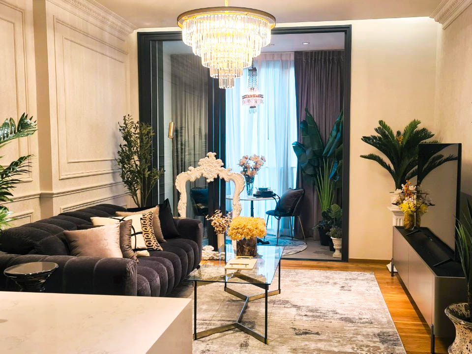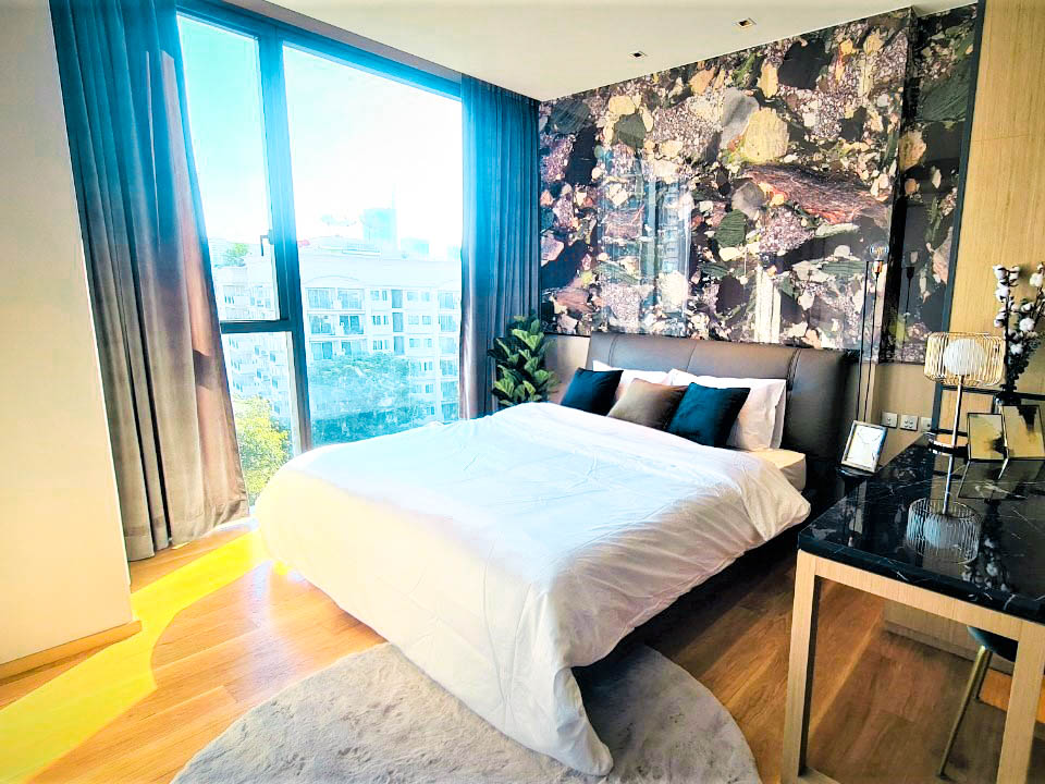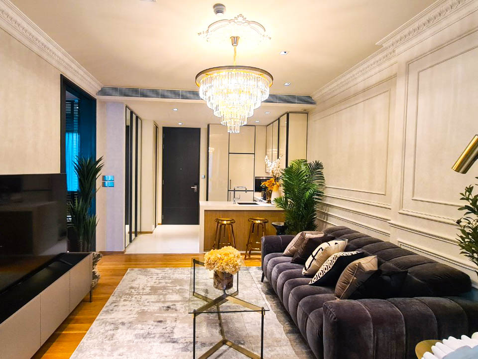 紹介しているお部屋は1ベッドルーム・57㎡であり、オープンキッチンや対面カウンターが配されており、オーナーの好みでラグジュアリーなソファやベッドなど贅沢な調度品が設置しております。こちらは所有する喜びを感じることができる物件です。(予想家賃 50,000~60,000バーツ)