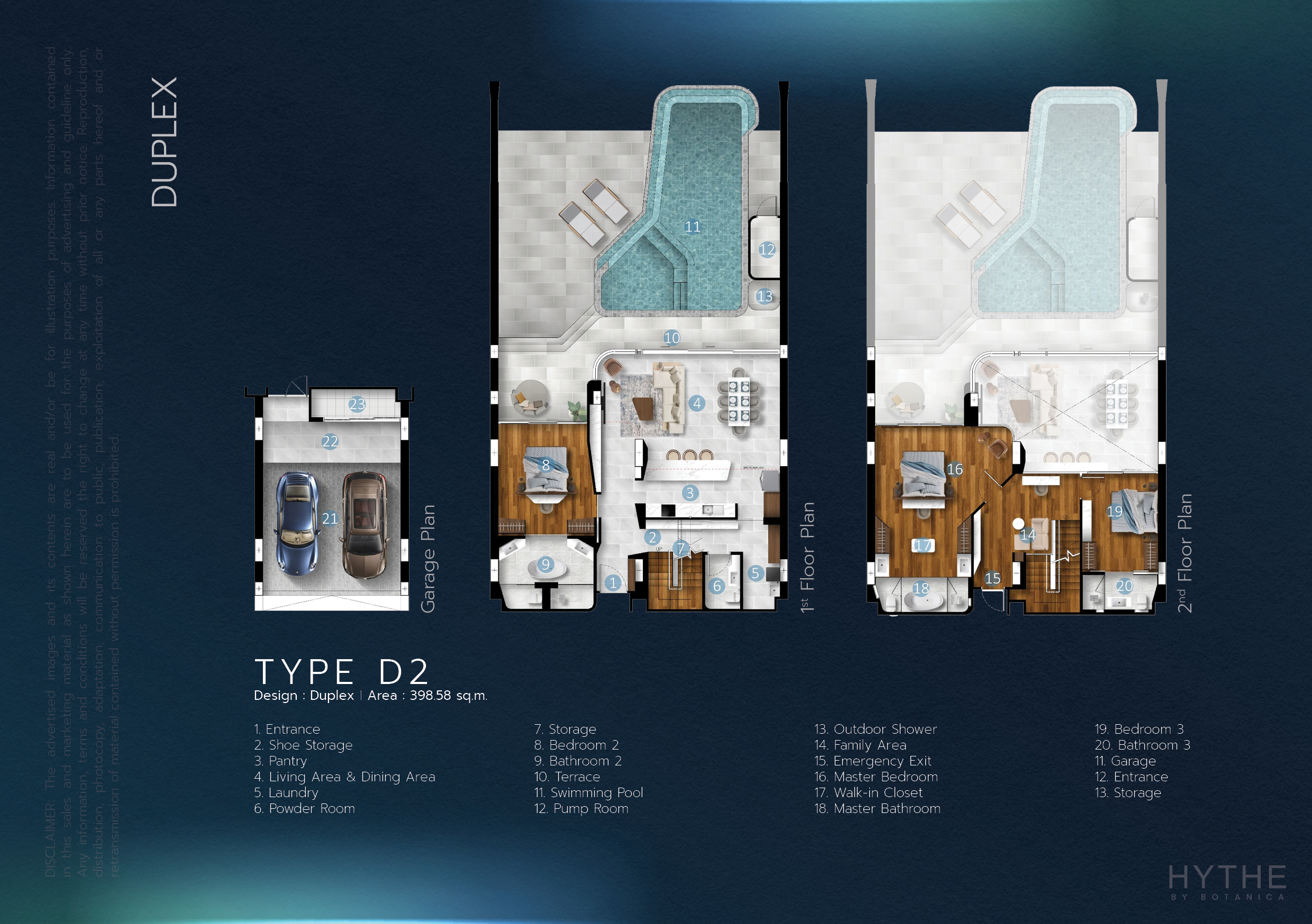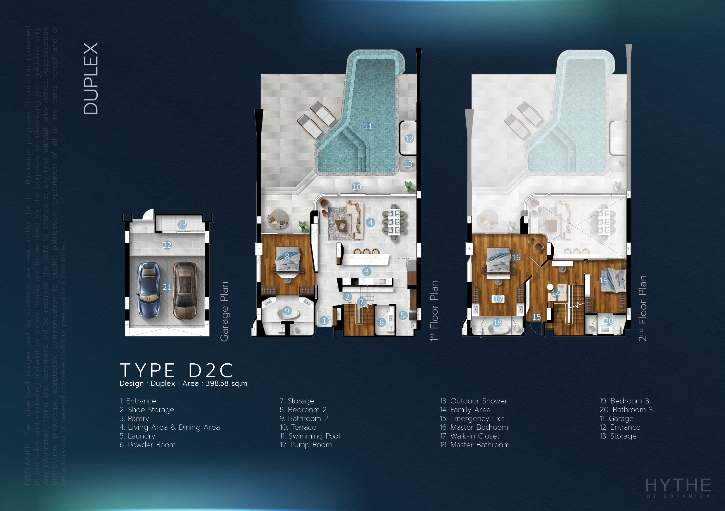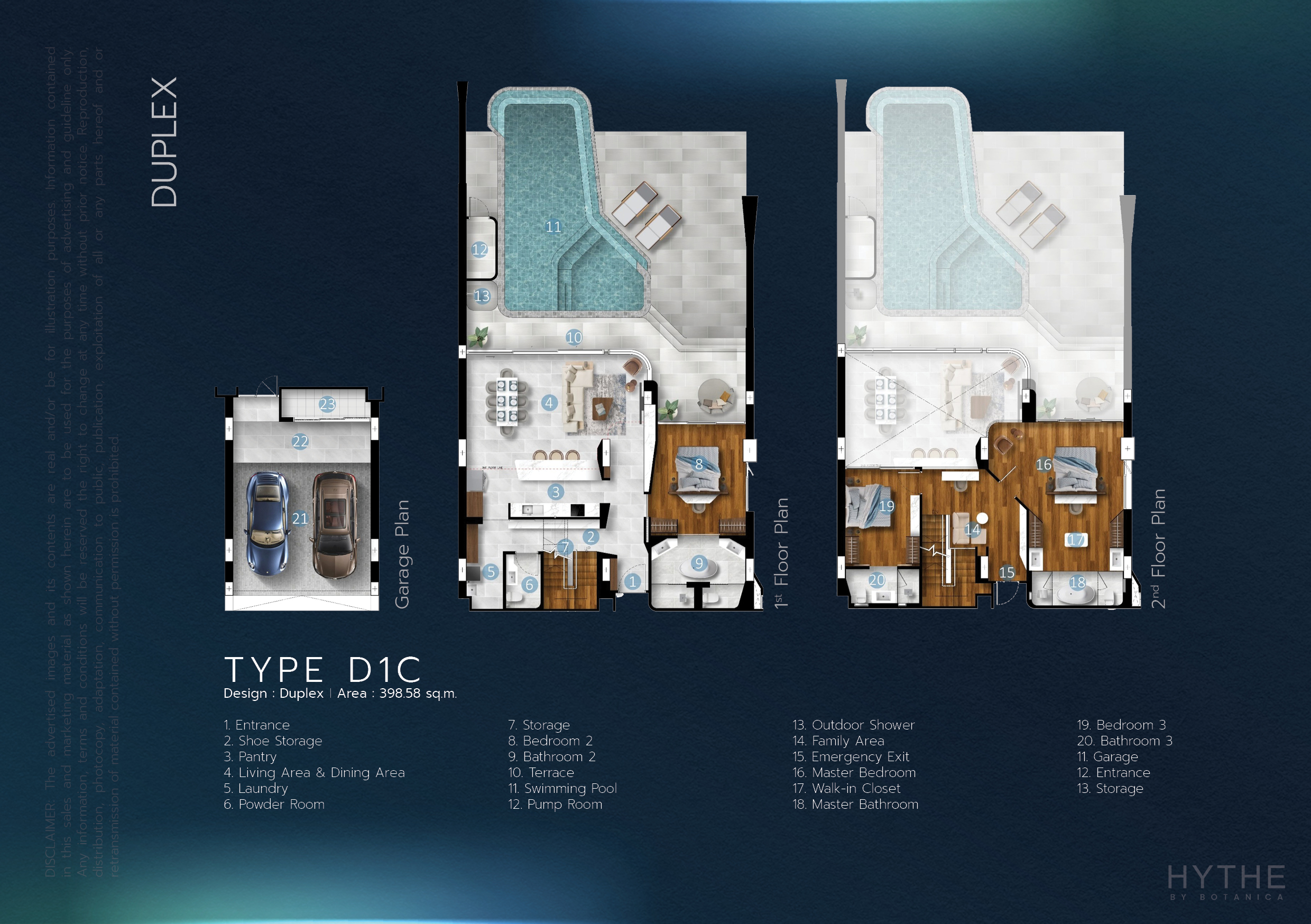 デュプレックス(3ベッドルーム)は全4タイプであり、398.58~403.98㎡の広さです。(販売価格は55,858,000バーツより)