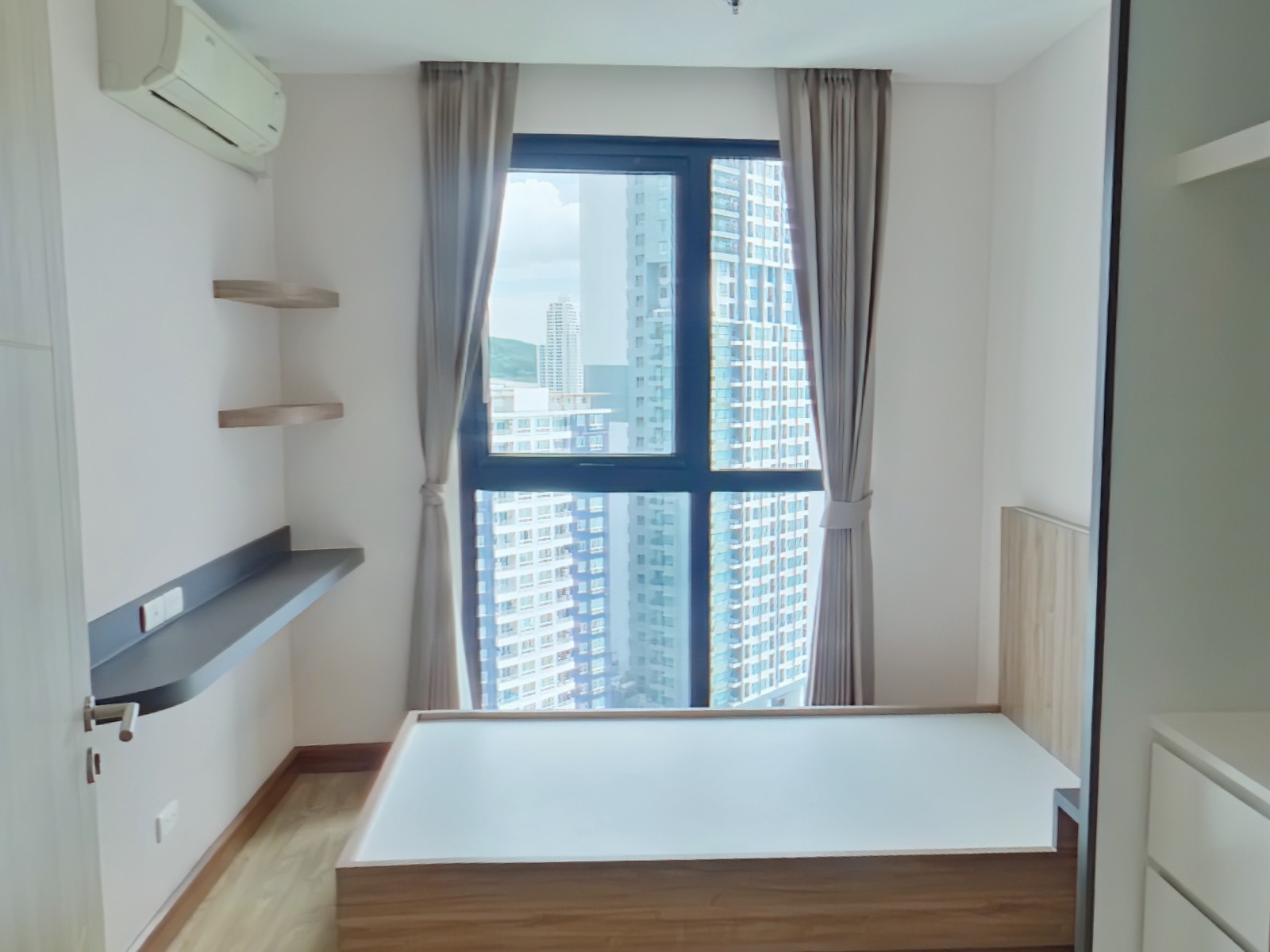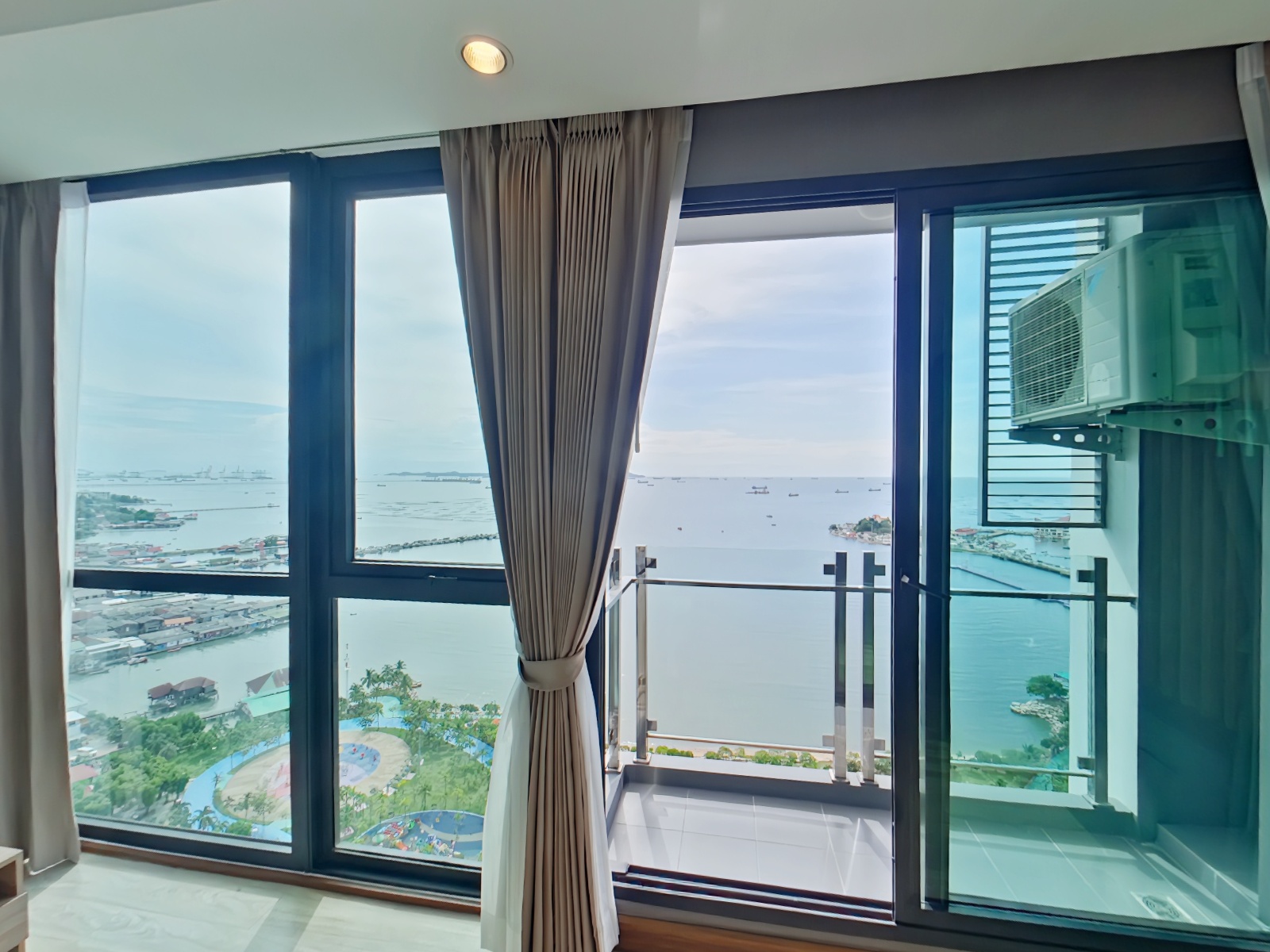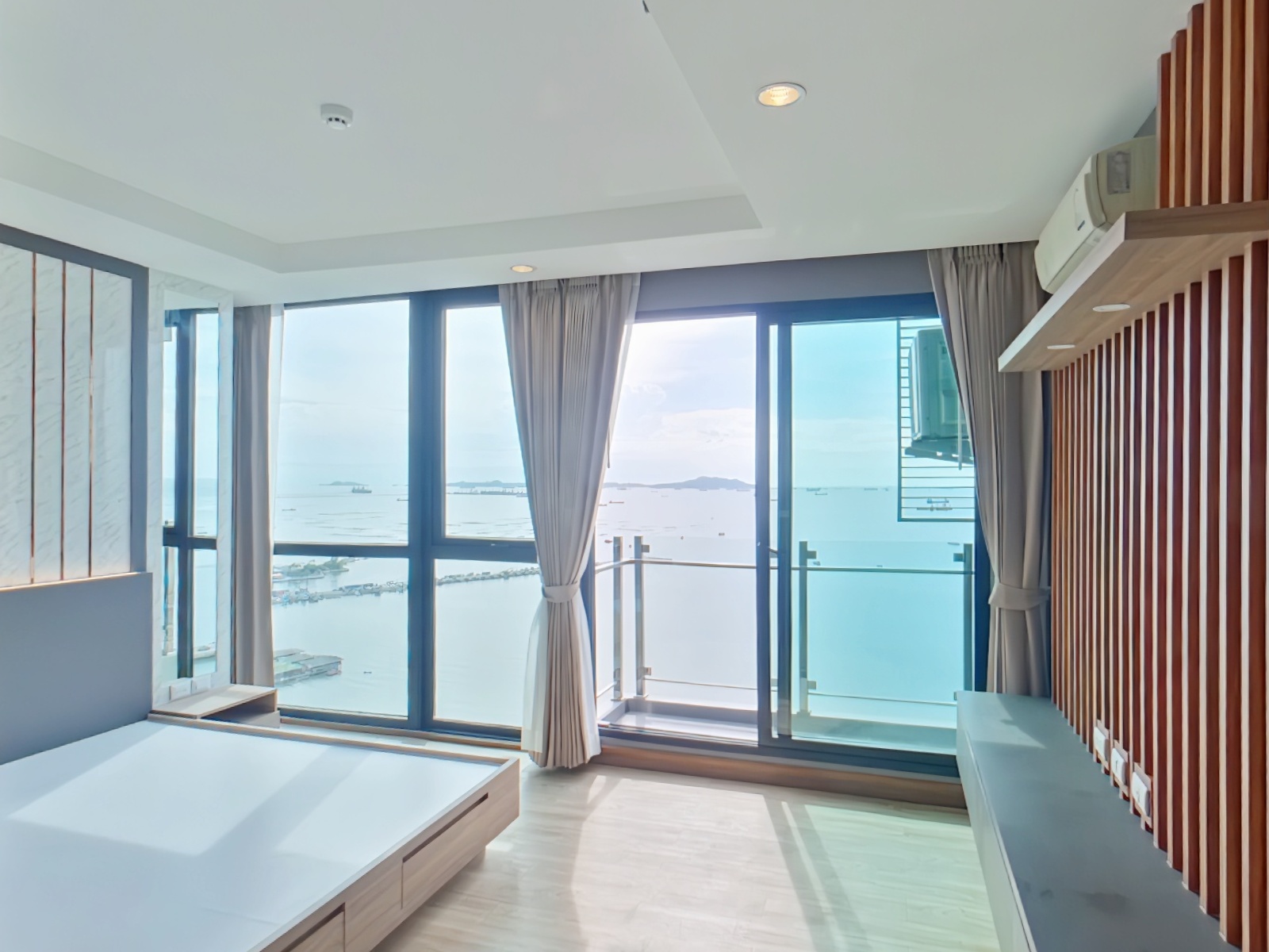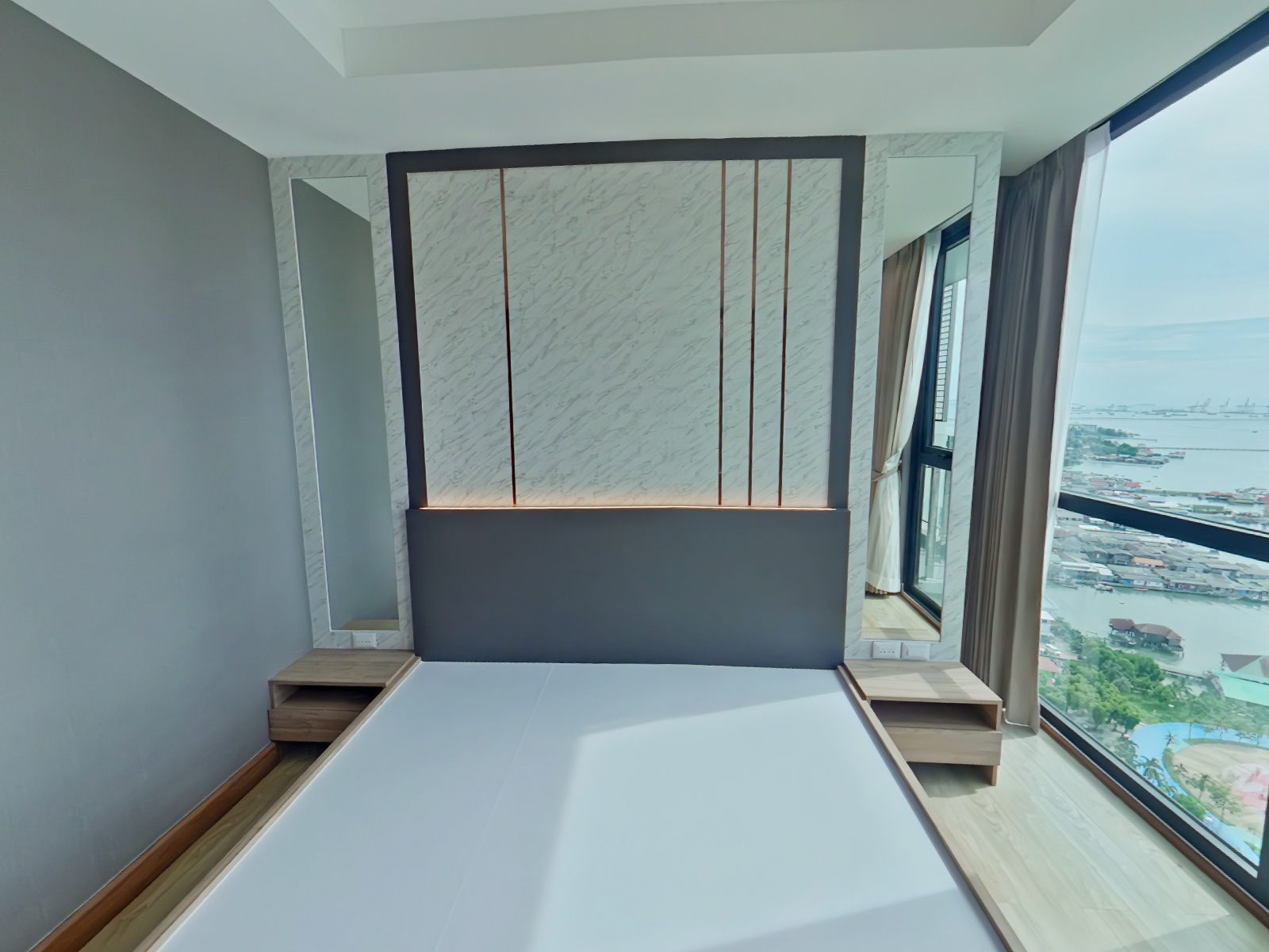 本物件は2016年完成、21階建と28階建の2棟から成る総戸数733室の大規模コンドミニアムで、シラチャ市内でも存在感のある物件です。ご紹介のユニットは2ベッドルームタイプ(約80.6㎡)であり、総階数28階の26階に位置するためリビングルームおよびマスターベッドルームからの眺望が非常に良好です。その為、低層階の同タイプでは得られない、シラチャ湾を望む開放的な景色が広がります。特に高層階ならではのオーシャンビューはこの物件の大きな魅力です。