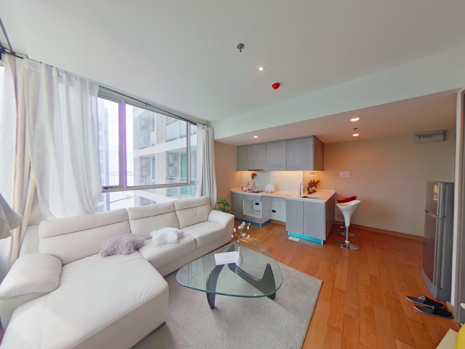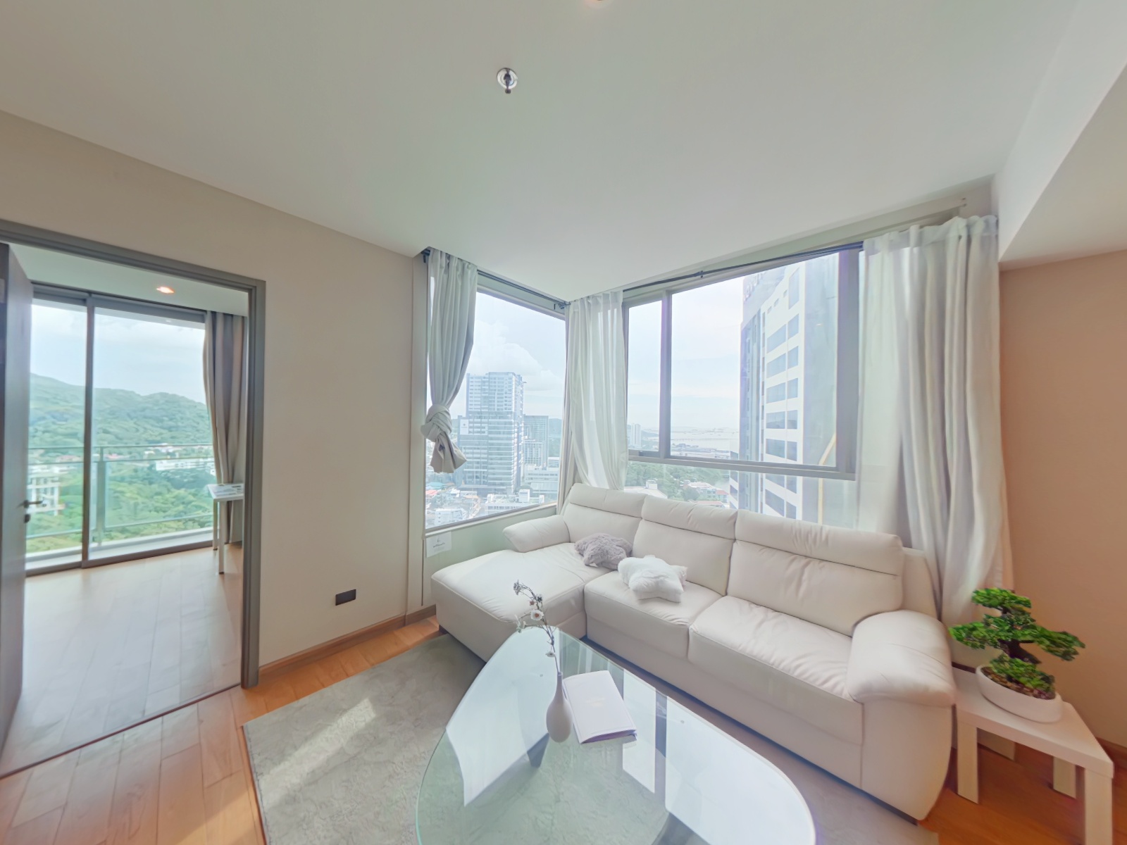 1ベッドルーム・47㎡の広さであり、コーナー部であるリビングルームは採光性が良く、緑豊かなシラチャのシティビューが楽しめます。シラチャエリアで考えるとかなり広めのレイアウトになっております。